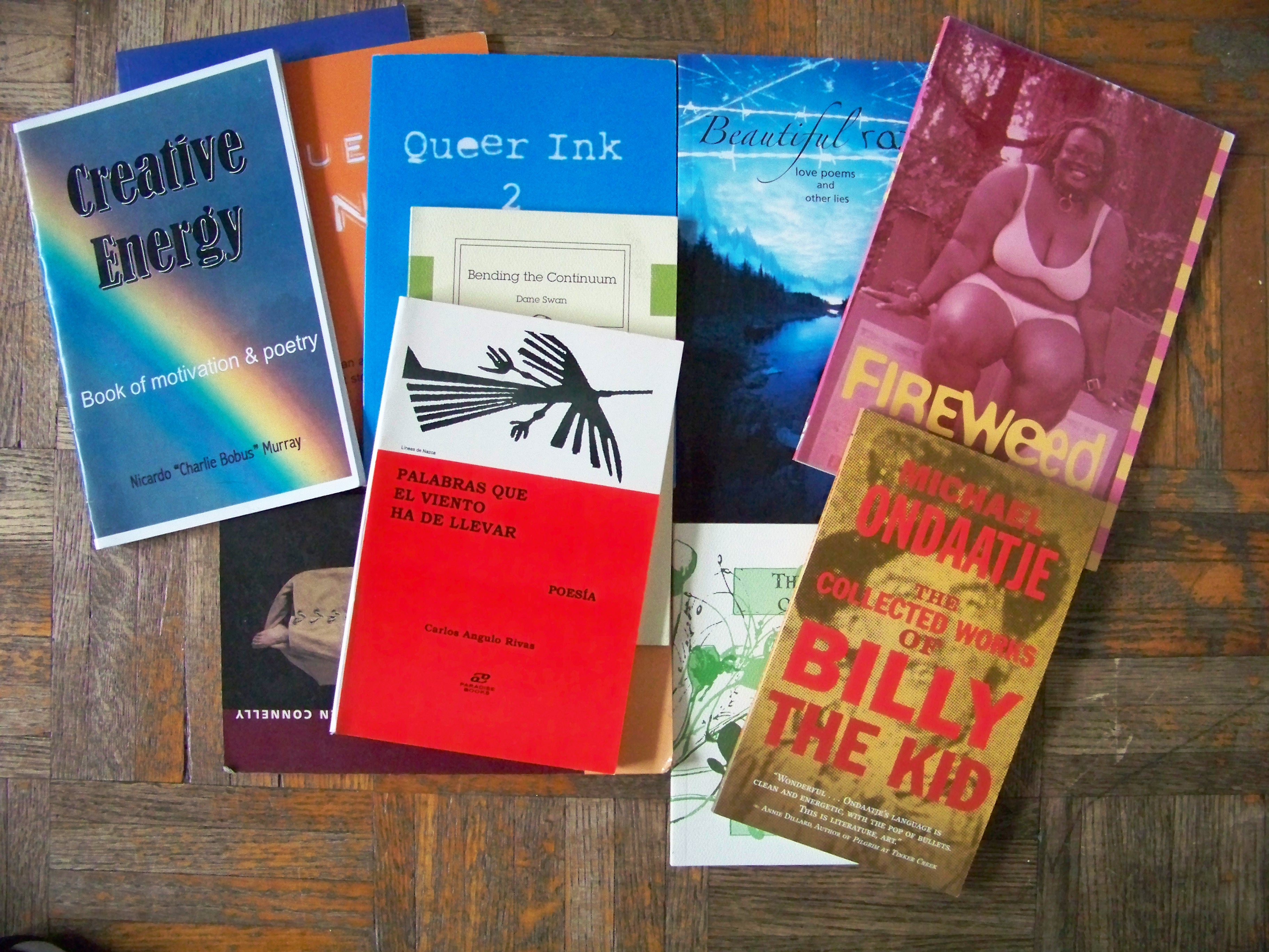 The poetry collections here I’ve been waiting to read for a while. Specifically Ondaataje’s The Collected Works Of Billy The Kid. I’ve heard so many great things about it. Karen Connolly and Al Hunter are poets I’ve wanted to read also and now I am. And Nicardo’s Creative Energy was given to me by my brother Rupert Harvey; Nicardo and I are in touch, I’ll be featuring him soon. The FIREWEED issue on FAT will be reviewed for the upcoming week on FAT Phobia that I am doing. FIREWEED is a great journal that I wish was still around; see the FIREWEED Mixed Race issue which is amazing!