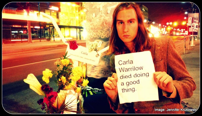 After reading the coverage of the death of cyclist Carla Warrilow, my brain began a familiar process of stigmatization of the site of the accident. It is a process that occurs somewhere between consciousness and subconsciousness. I do this every time a bike death occurs in Toronto. In this case, it was Dundas St. West and Spadina Avenue. I have caught myself visualizing the intersection and painting it with a sense of doom, a dark cloud, and telling myself that that intersection is too dangerous now; it is off limits for me.